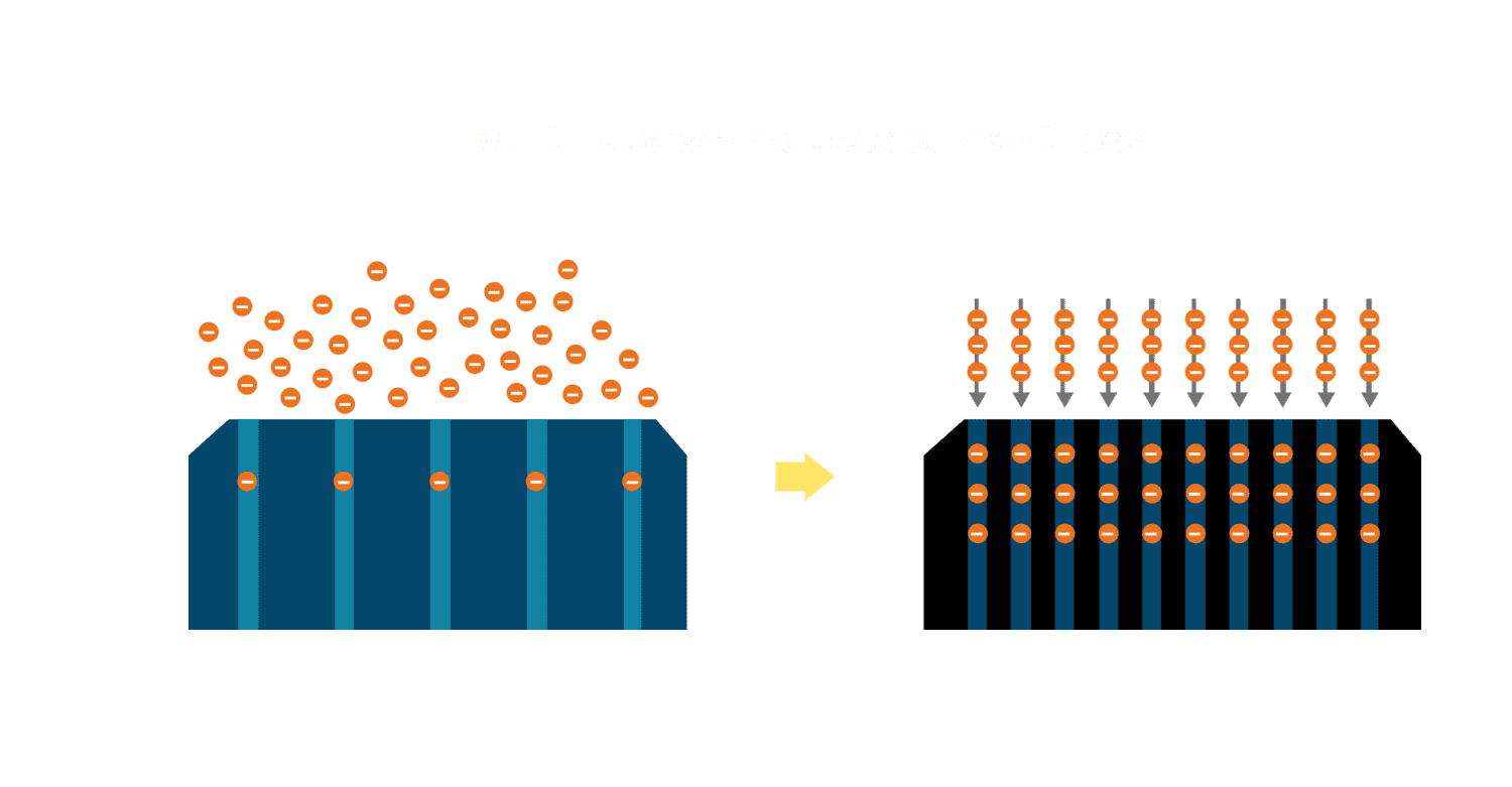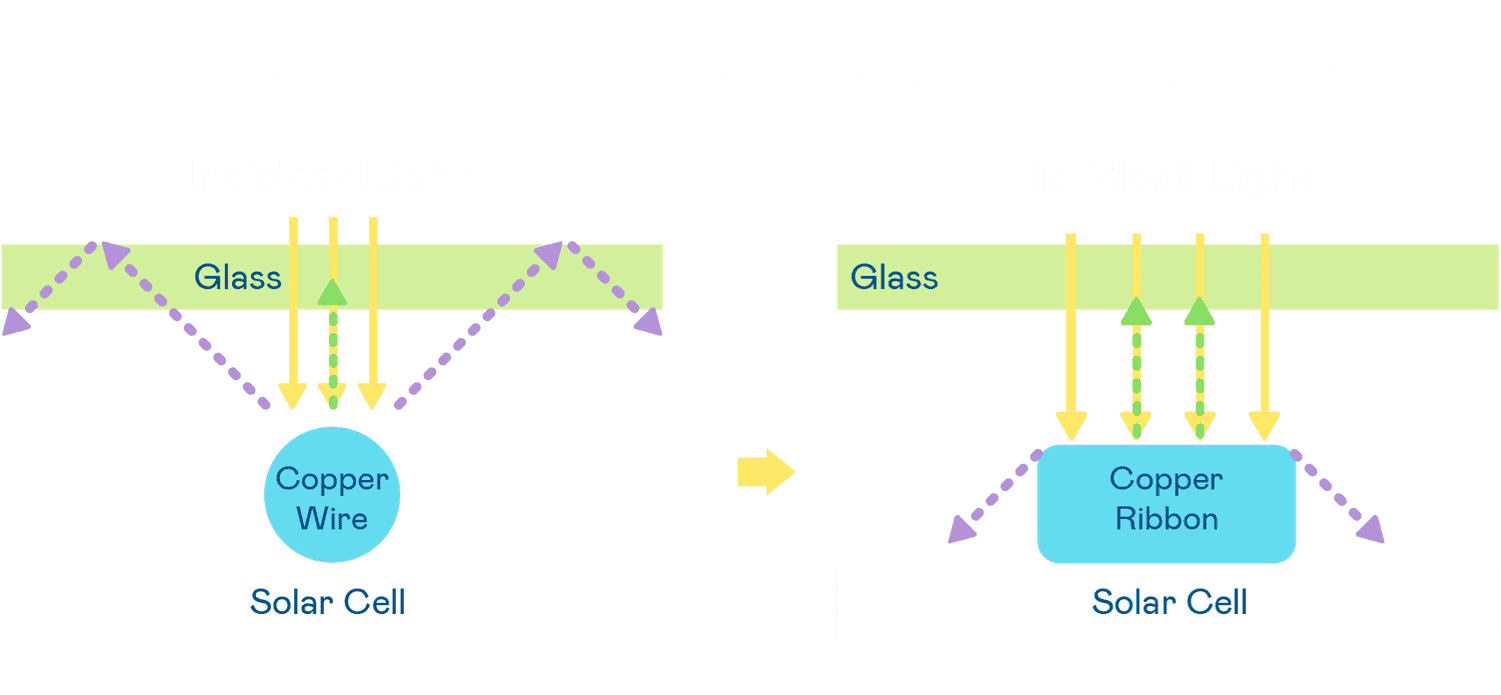 - 电池使用多条铜导线 (Copper wire) 于电池片上形成较短的电流路径,,,,提高电流收集效率,,,采用圆形设计的铜导线较传统扁平式的铜焊带 (Ribbon),,,,可增加入射至电池的光线量。。。