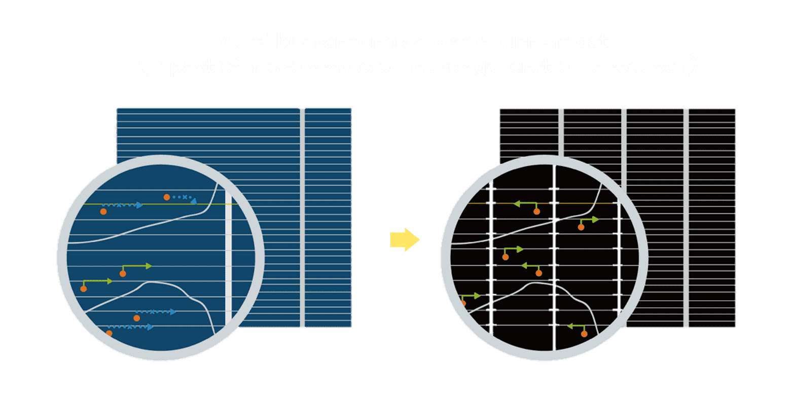 - 多条电极栅结构,,,,可有效降低外力对于电池的影响,,限制电池隐裂 (Micro-cracks) 范围,,防止电流传输路径 (Current distribution) 之损坏进一步扩大。。