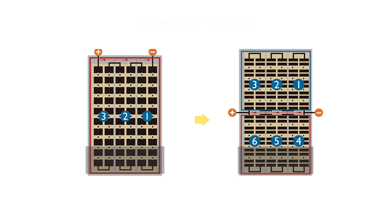 - 结合半切电池,,降低遮阴影响、、、、提升模组抗隐裂能力、、、、并减少电阻损耗,,进一步提升模组发电效能。。。